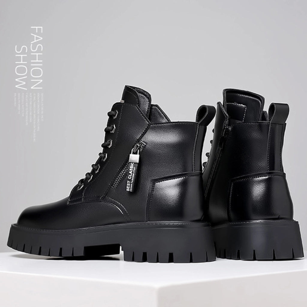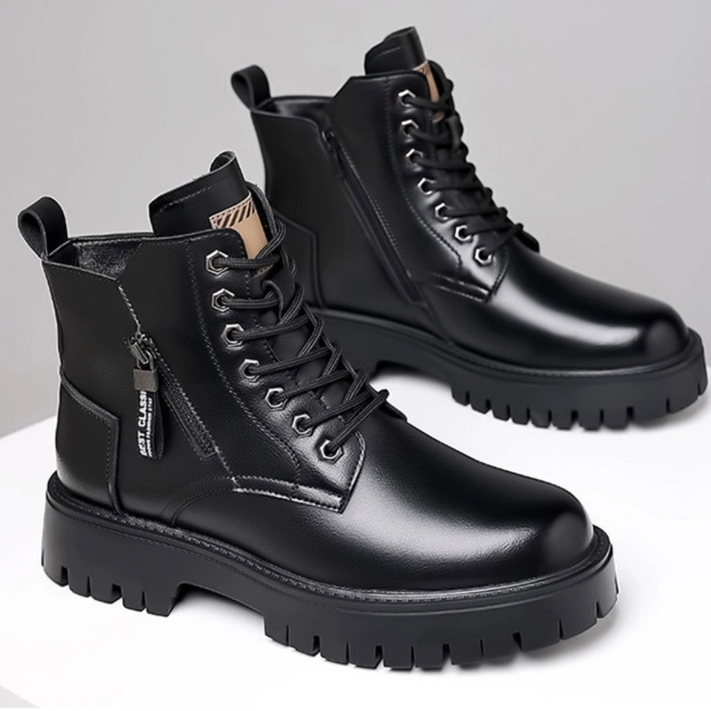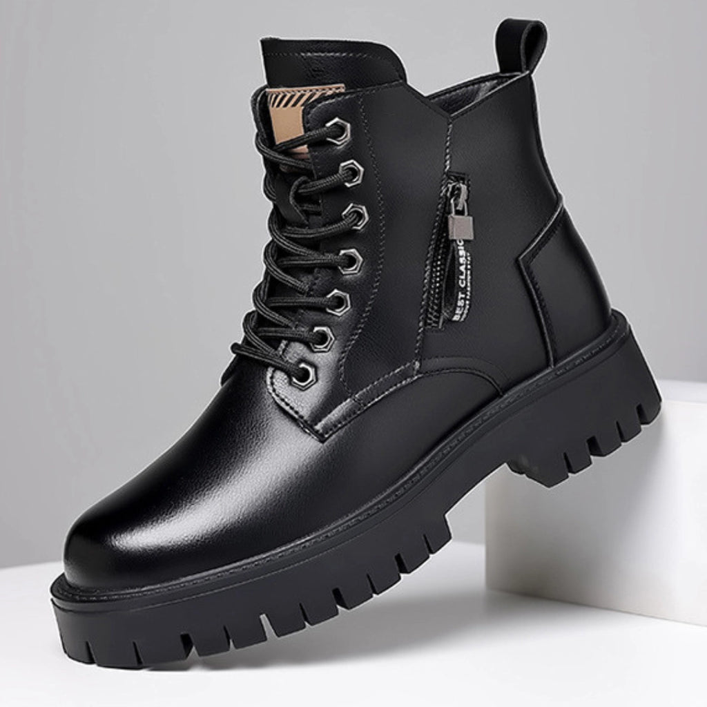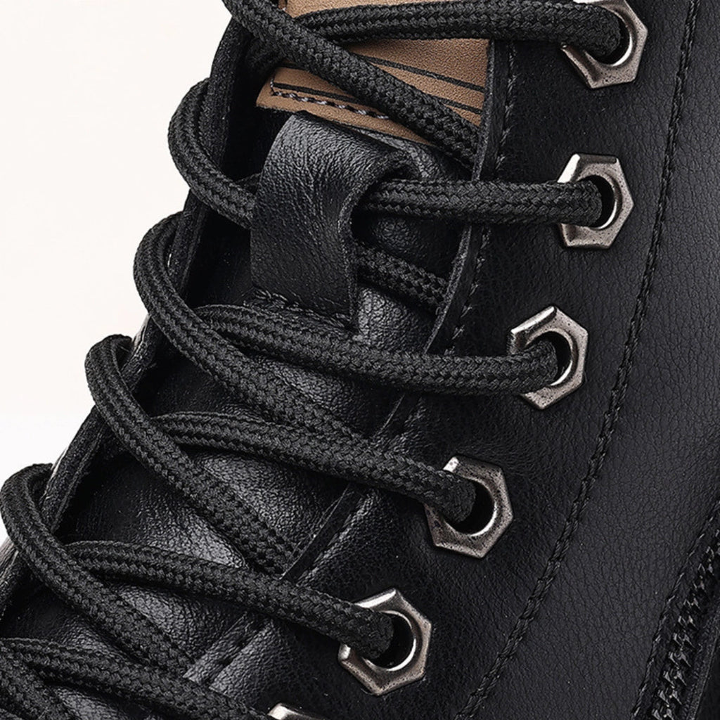 The Men’s Premium Leather City Boots are built for cold-weather commuting and everyday urban wear. Crafted in smooth black leather with a supportive ankle profile, lace-up front and practical side zip, they deliver a confident, modern silhouette with easy on-and-off. Finished with a warm wool lining and a chunky anti-slip rubber outsole, they’re designed to keep you comfortable, stable and protected through winter streets and wet pavements.